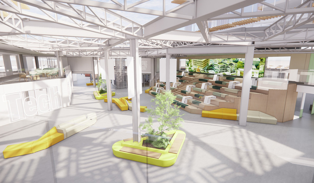 The building is organised around a central Agora, covered by a transparent roof that regulates the temperature according to the amount of sunlight.
